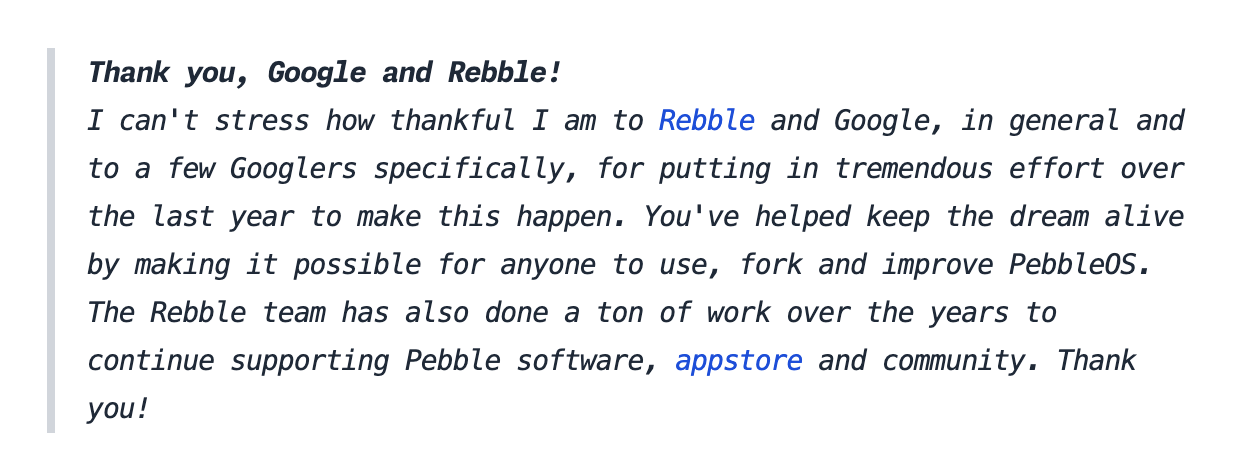 PebbleOS is now open source! Yay. This is thanks to the work of many Googlers, ex-Pebblers and others - I called out (hopefully) all of them in my blog post in March. I really wanted Rebble to be a part of the Pebble revival going forward. I hired 3 people from Rebble to join Core Devices. I regularly brought up Rebble’s efforts over the years.