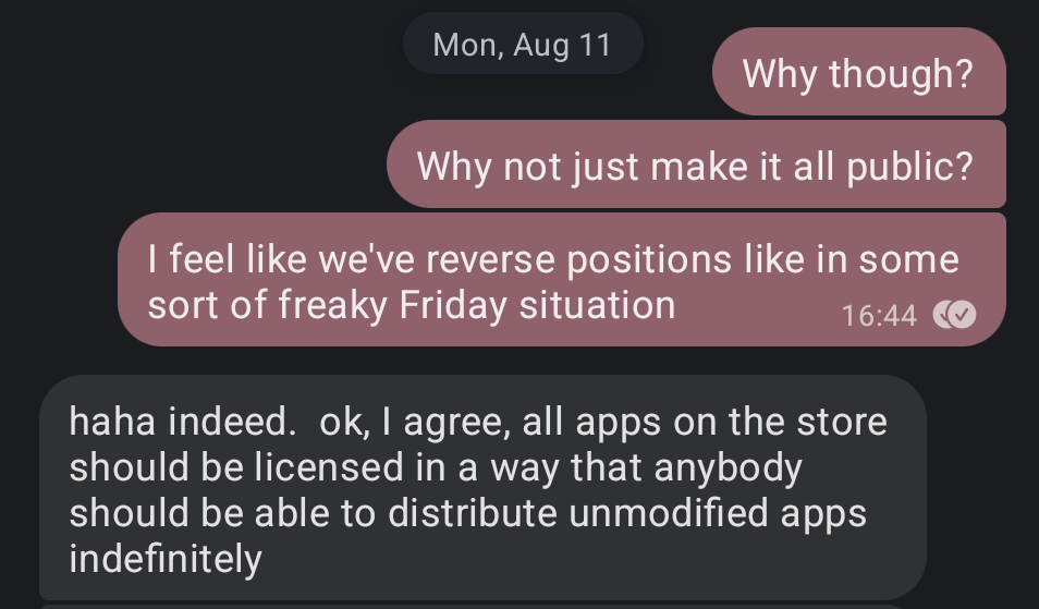 Looking back, we should have had more clear wording in this agreement. But this was after months of chat discussions and hours of Zoom calls. I honestly thought that we had reached an agreement to make the archive open, like in this message I received from a Rebble board member.